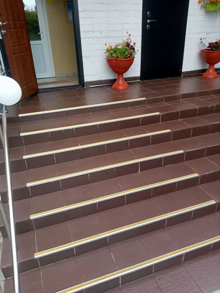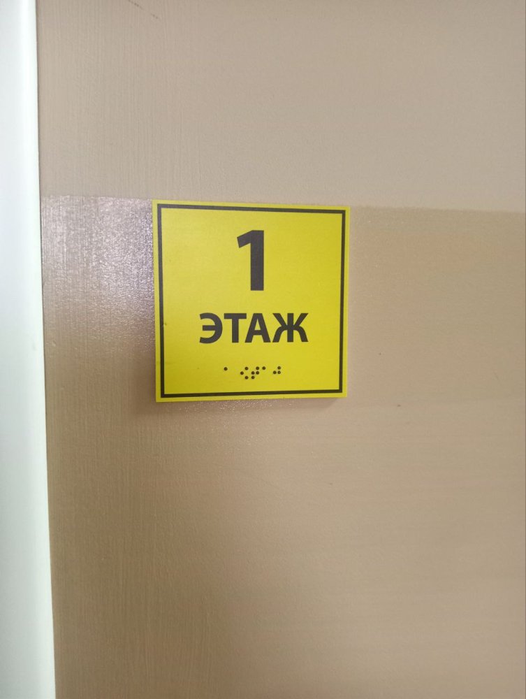 На ступеньках есть разметка желтого цвета, на перилах и этажах установлены тактильные знаки и таблички со шрифтом Брайля.