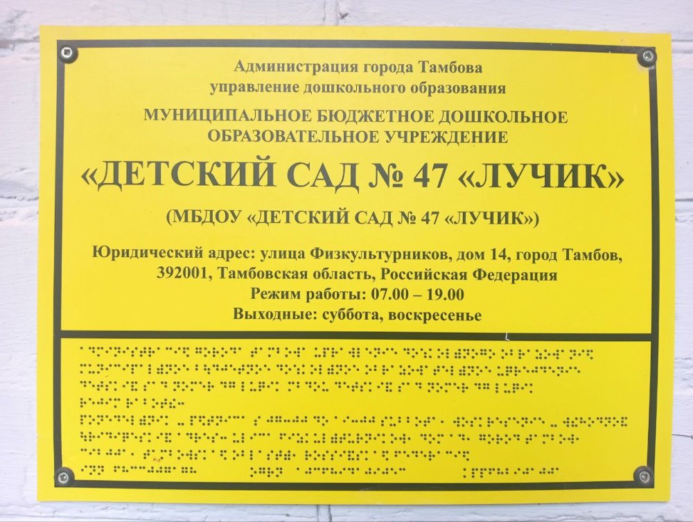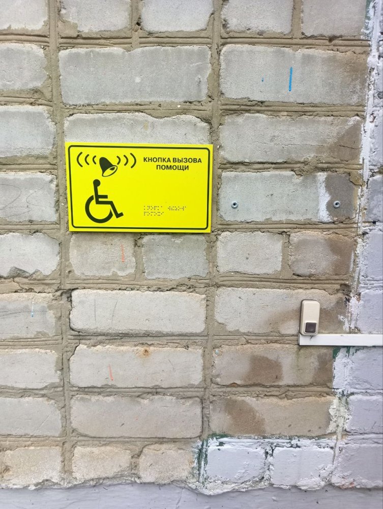 У центрального входа в здание детского сада имеется информационная табличка со шрифтом Брайля. Установлен звонок для вызова персонала.